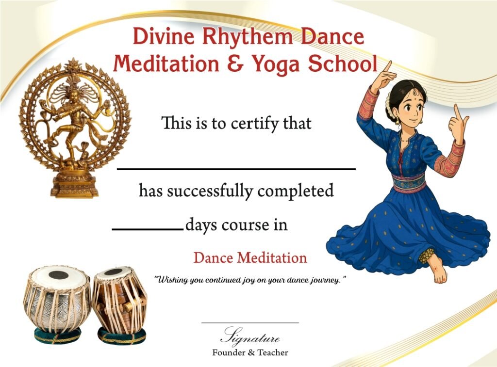 At the end of our 7, 15, or 24 days Dance & Meditation Courses, students will receive a Certificate of Completion from Divine Rhythm.